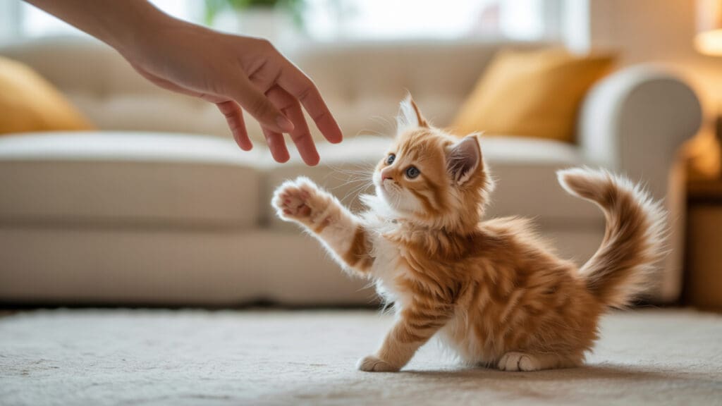 Let’s talk about your morning routine first. You should begin the day with your kitten with very gentle interactions. Your little feline will be alert, but your calmness will ground them. Try a soft greeting and blink slowly at them. A light petting before breakfast is also a good touch.